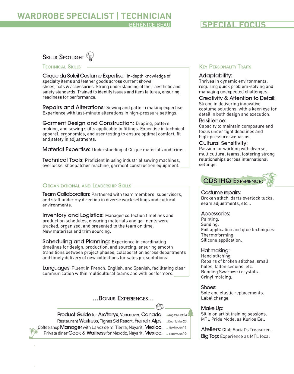 My experience in circus and theatre productions has allowed me to put this passion into practice: handling construction, alterations, laundry, repairs, and fast-paced backstage support. Whether at the sewing table or in the middle of a fitting, I thrive on making sure costumes not only fit but also empower performers to give their best.